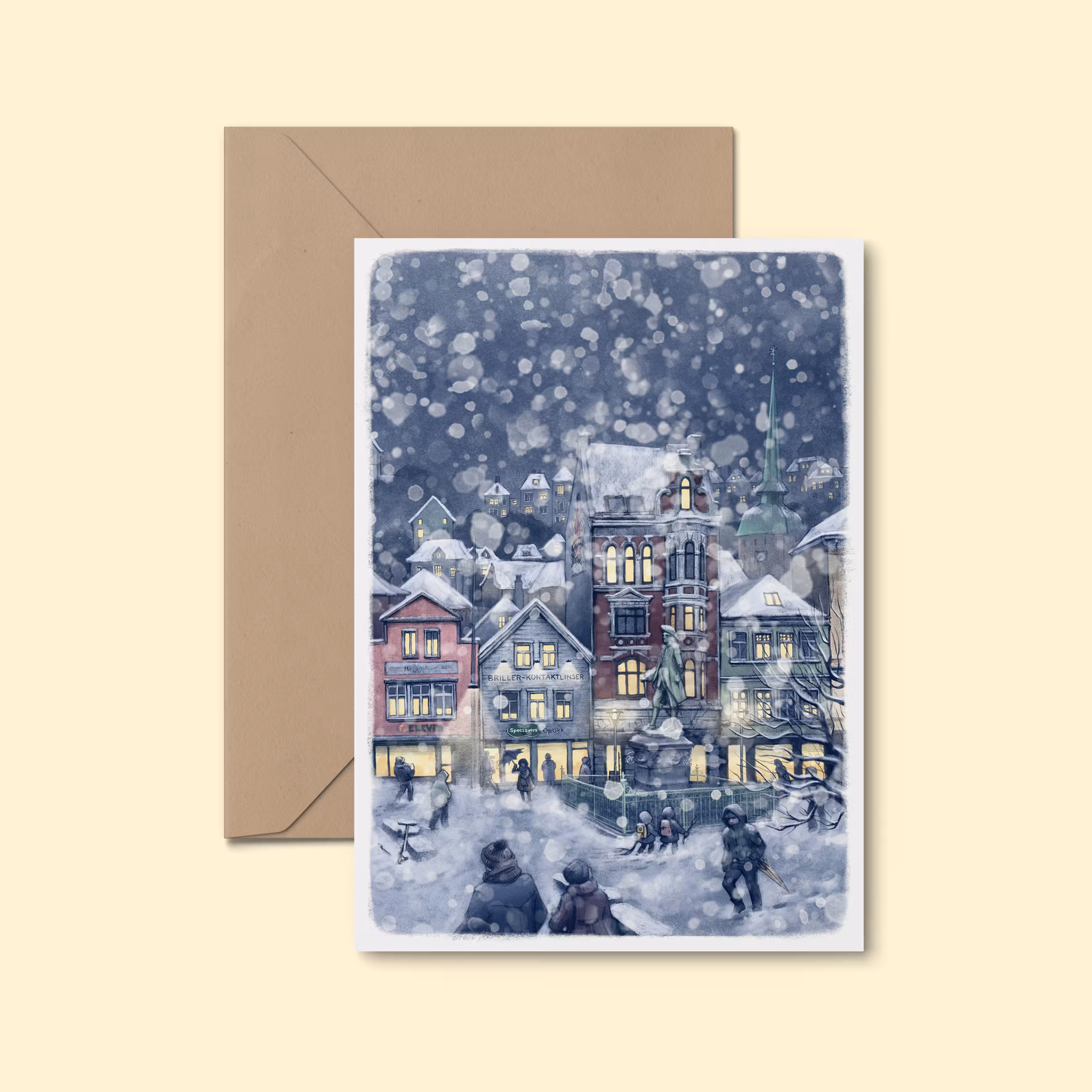 Kort med 3 ulike utsnitt av kunsttrykket Det snør? fra 2022. Motivet er fra Vågsallmenningen i Bergen, og er inspirert av sangen Når himmelen faller ned av Anne Grete Preus - og av årets første snøfall i byen.